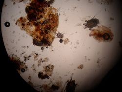Adultes et œufs d’Otodectes cynotis examinés au microscope